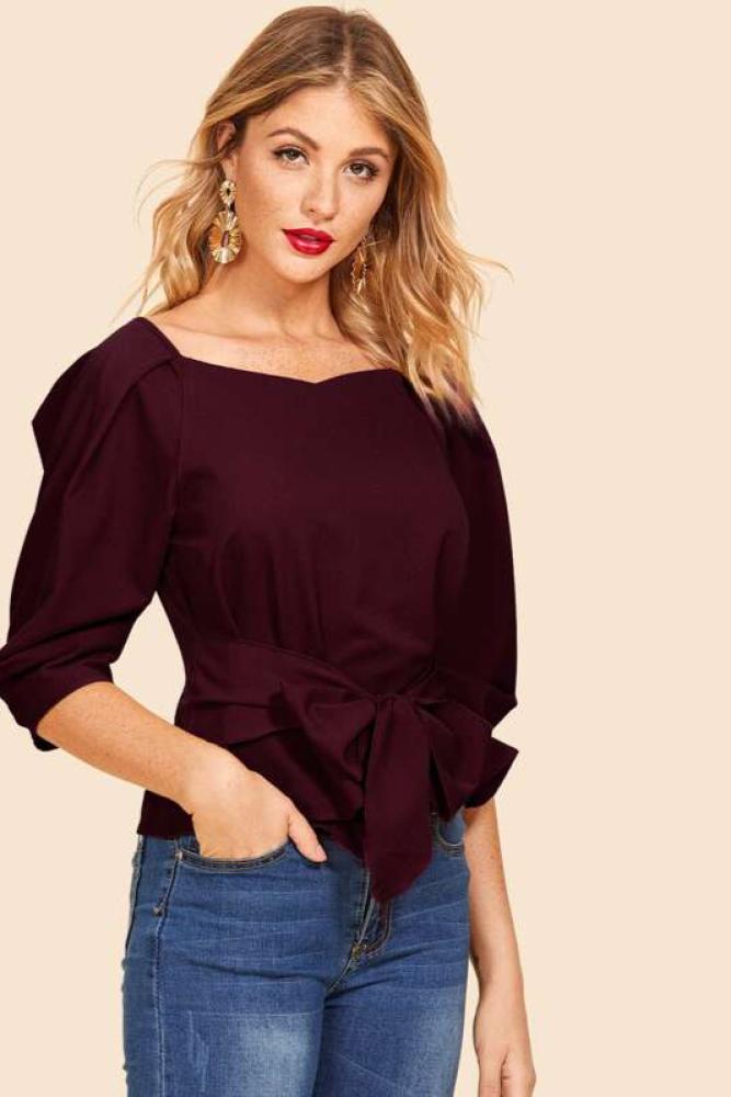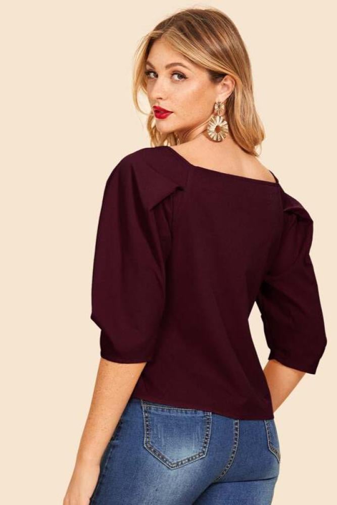 بلوزة بلون عنابي أنيقة تأتي بستايل أكمام واسعة وقصيرة بشكل جذاب.